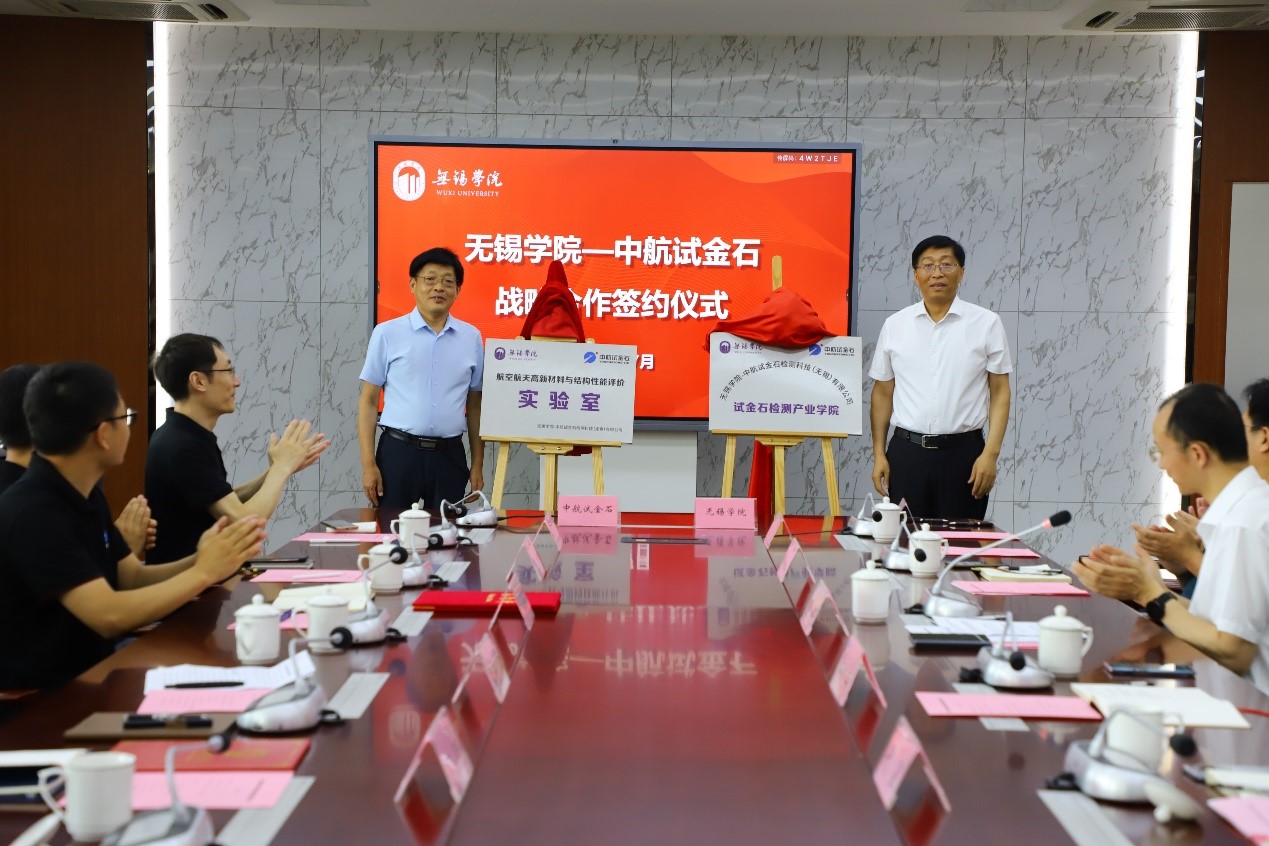 王海军总经理从产学研合作、产业学院落地、联合科研平台建设、优秀人才互聘等多个方面对校企双方战略合作规划进行了介绍。随后,在张永宏校长、李鲁林董事长和代星副区长的共同见证下,科技处副处长延星和无锡公司总经理王海军分别代表学校和中航试金石无锡公司签署了战略合作协议。接下来,张永宏校长、李鲁林董事长两位领导为校企双方共建的“试金石检测产业学院”和“航空航天高新材料与结构性能评估实验室”进行了揭牌。