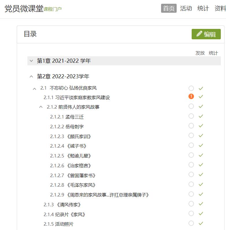 教工党支委提前在课程上传了本次活动的相关学习资料,主要包括习近平谈家庭家教家风建设、前贤伟人家风故事、《清风传家》、纪录片《家风》等内容。