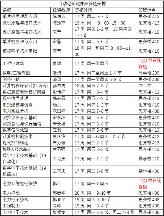 临近期末考试,为了落实“以学生为中心”的人才培养理念,自动化学院专任教师以充分关心学生、主动为学生答疑解惑为目的,明确了专业课程答疑的具体安排: