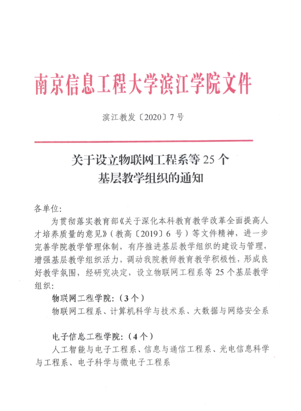 关于设立物联网工程系等25个基层教学组织的通知(滨江教发〔2020〕7号)