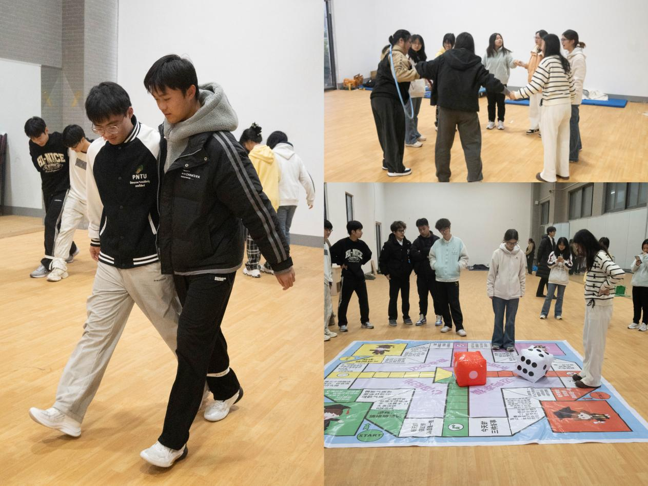 在体育馆舞蹈房,同学们参与了“两人三足”“一圈到底”“心理大富翁”等趣味项目,在互动中增进默契,在运动中释放压力,亲身体会到沟通协作与团队信任的重要性。
